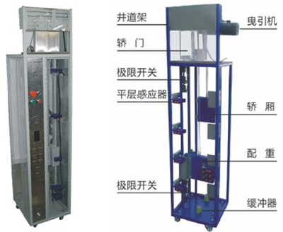 1、模型電梯設(shè)4層4站,由模擬井道架、轎廂、對(duì)重、曳引機(jī)、電梯門、門電機(jī)、各層站外呼盒及主要安全裝置組成,固定設(shè)置在實(shí)驗(yàn)臺(tái)側(cè)面。模擬井道架內(nèi)需配置用于檢測(cè)轎廂位置的樓層感應(yīng)器、平層感應(yīng)器(與實(shí)際電梯相似)等,其接線端子引至模擬井道架的插接孔上。井道架采用金屬材料為主體支架,有機(jī)玻璃封閉。